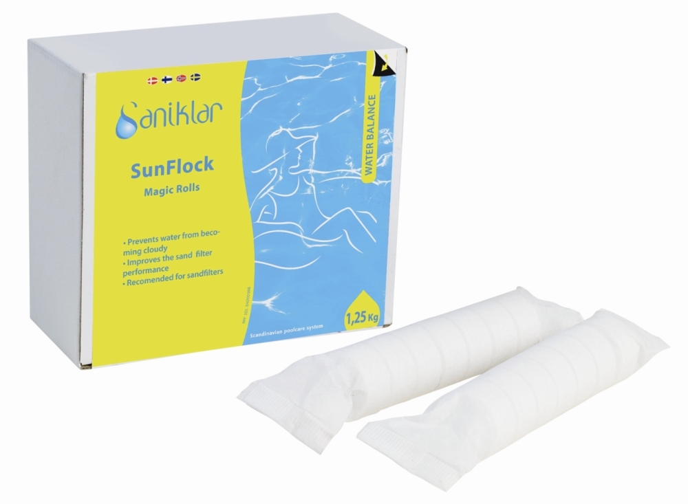 För att ett sandfilter skall fungera effektivt krävs kontinuerlig tillförsel av flockningsmedel. SunFlock Magic Rolls är ett flockningsmedel som upplöses långsamt. En 125 g-rulle läggs i bräddavloppets korg och doseringen sker därefter automatiskt under de närmast följande dagarna. SunFlock samlar ihop de små svävande partiklarna i vattnet till större flockar som fastnar i sandfiltret. De uppsamlade flockarna med föroreningar rensas bort ur filtret genom en normal retursköljning. SunFlock kan användas i alla pooler med sandfilter och tillsammans med både klorfria och klorhaltiga poolkemikalier. Finns även i storpack